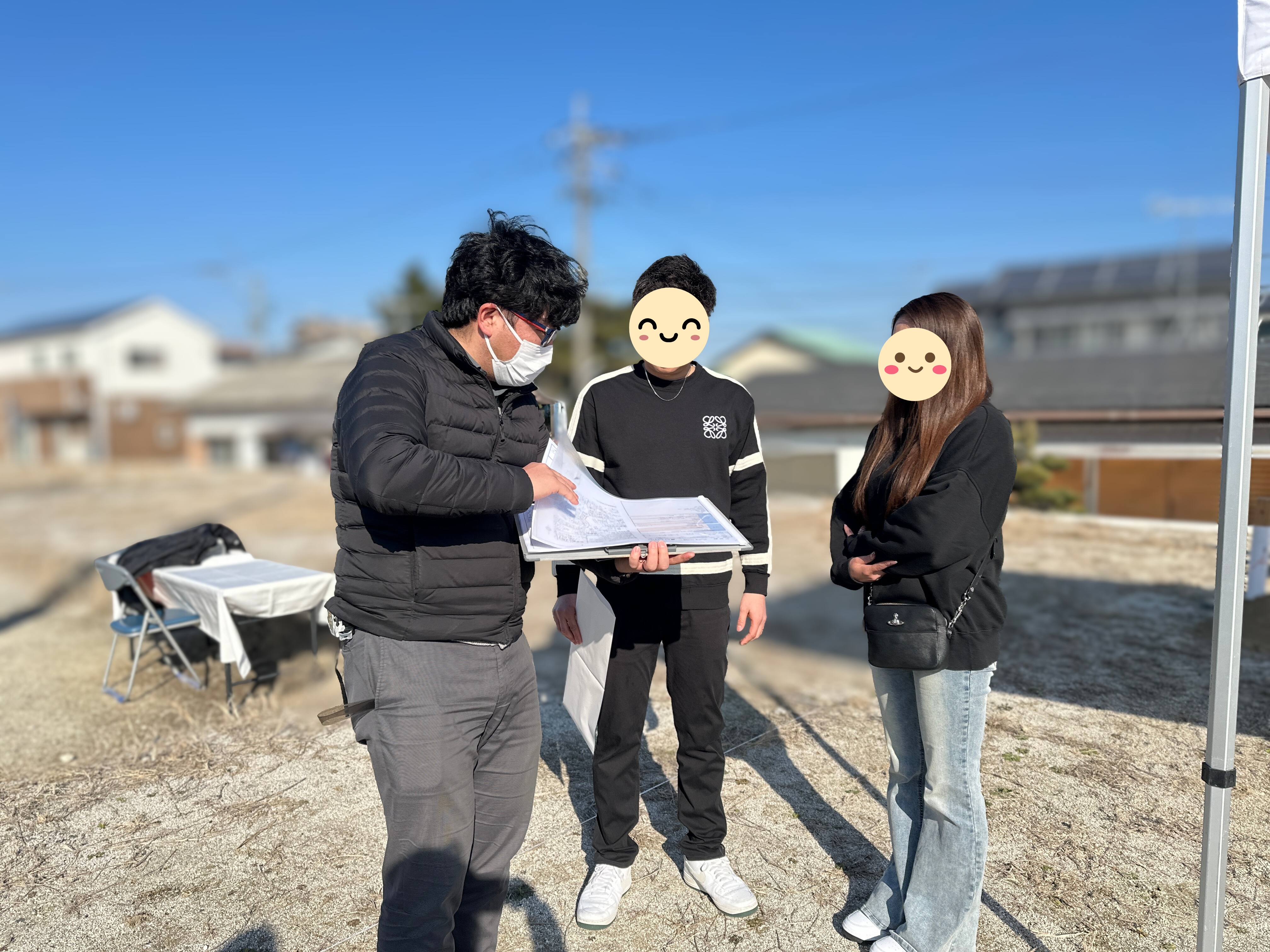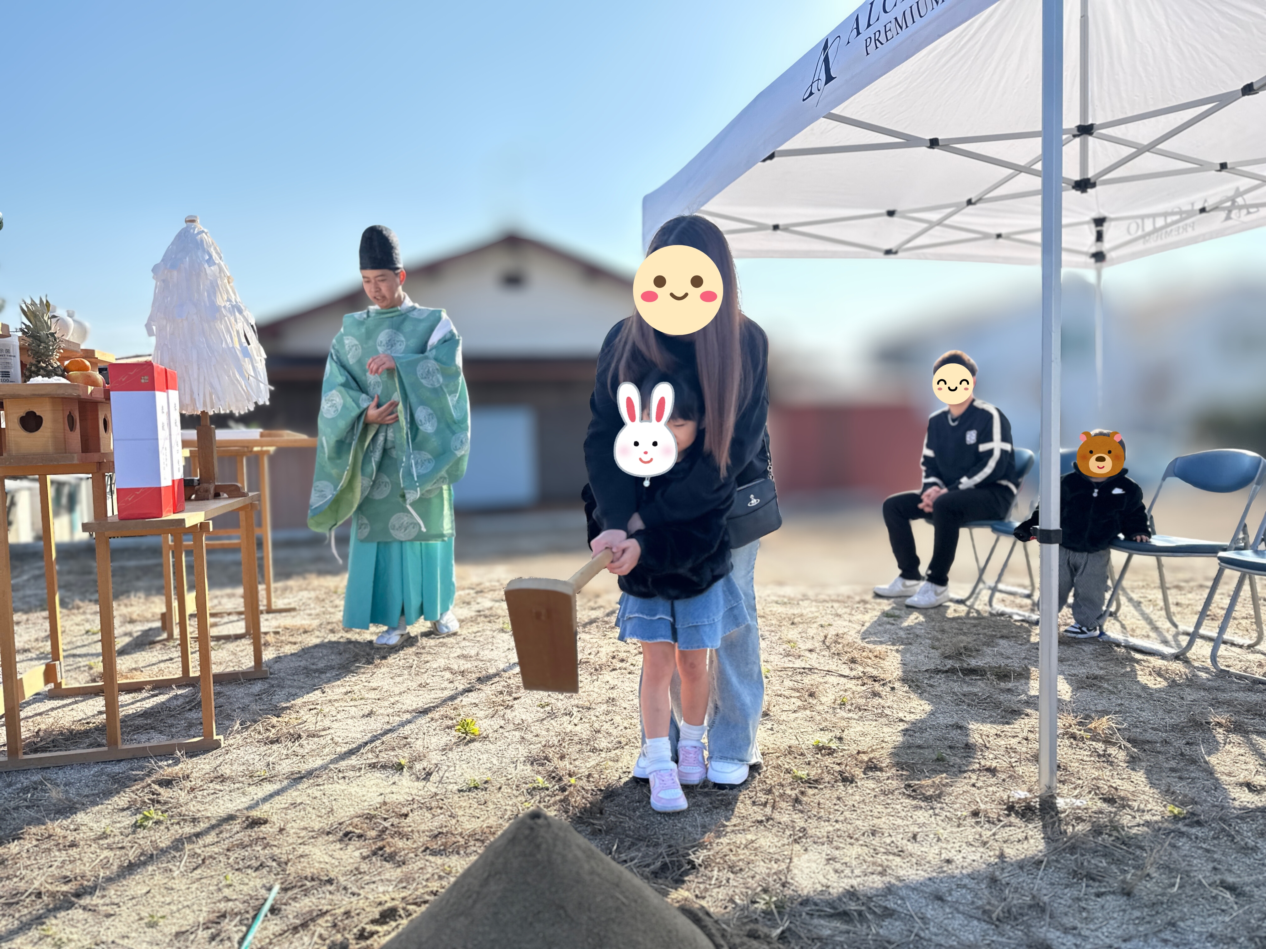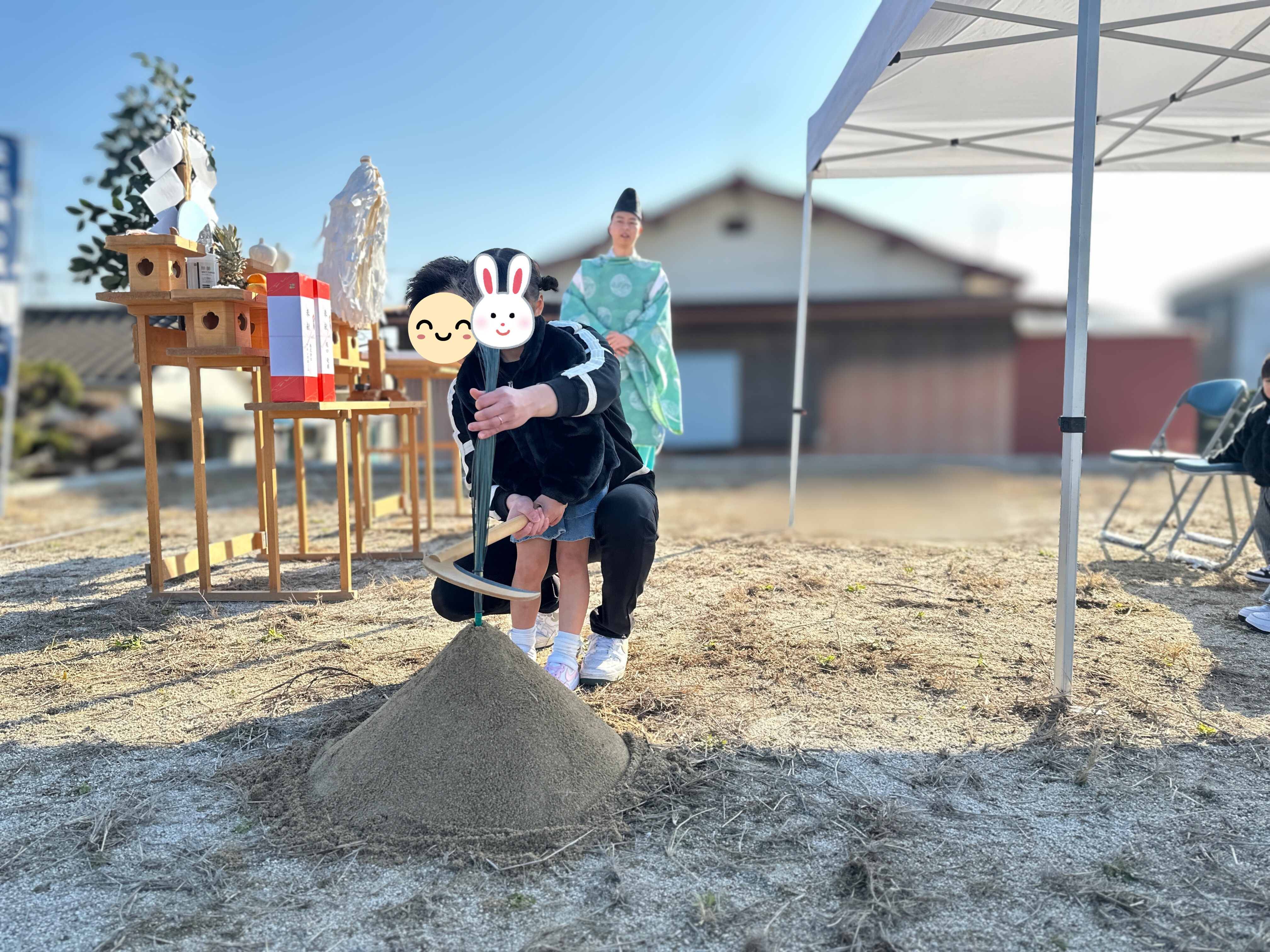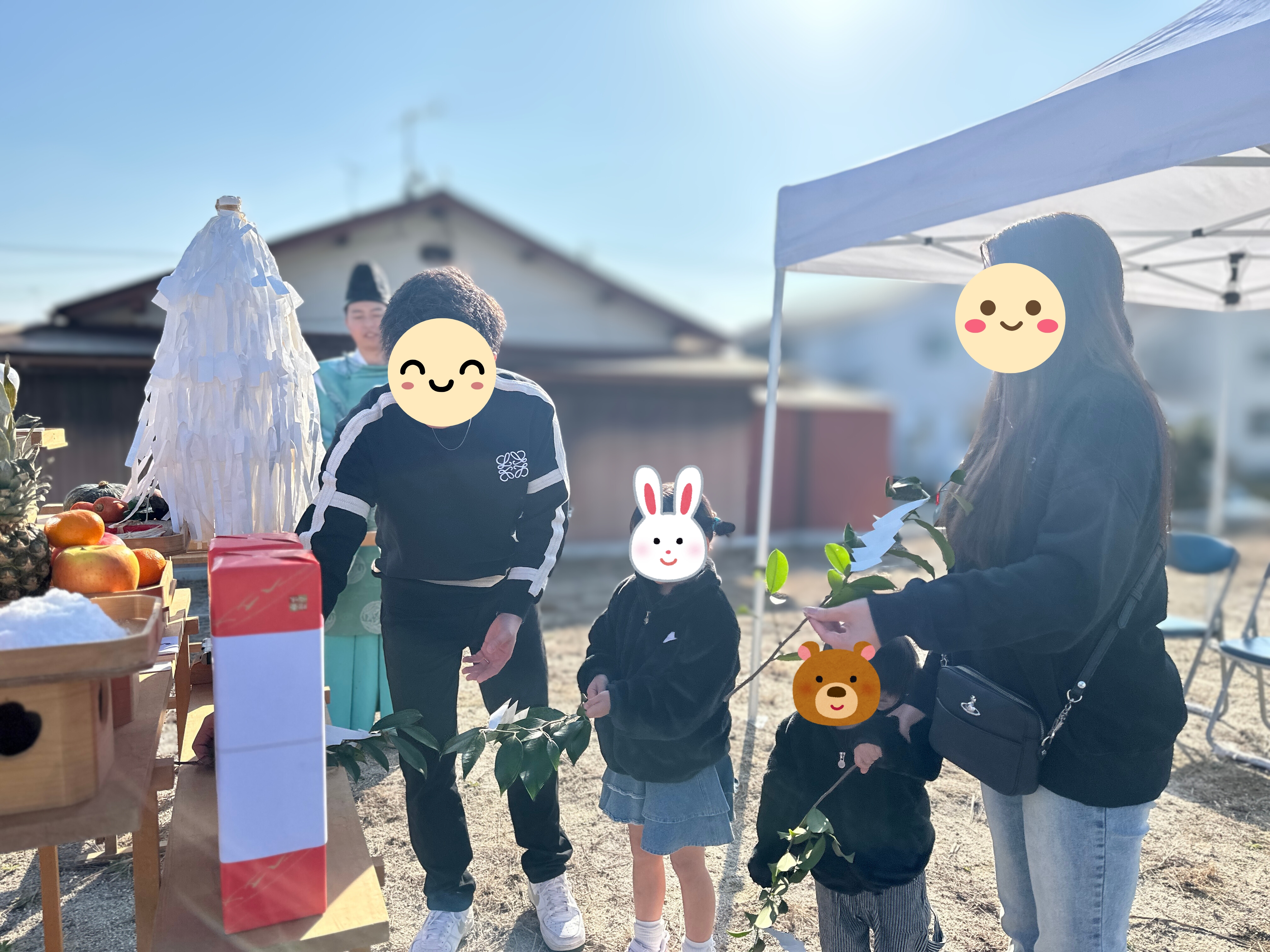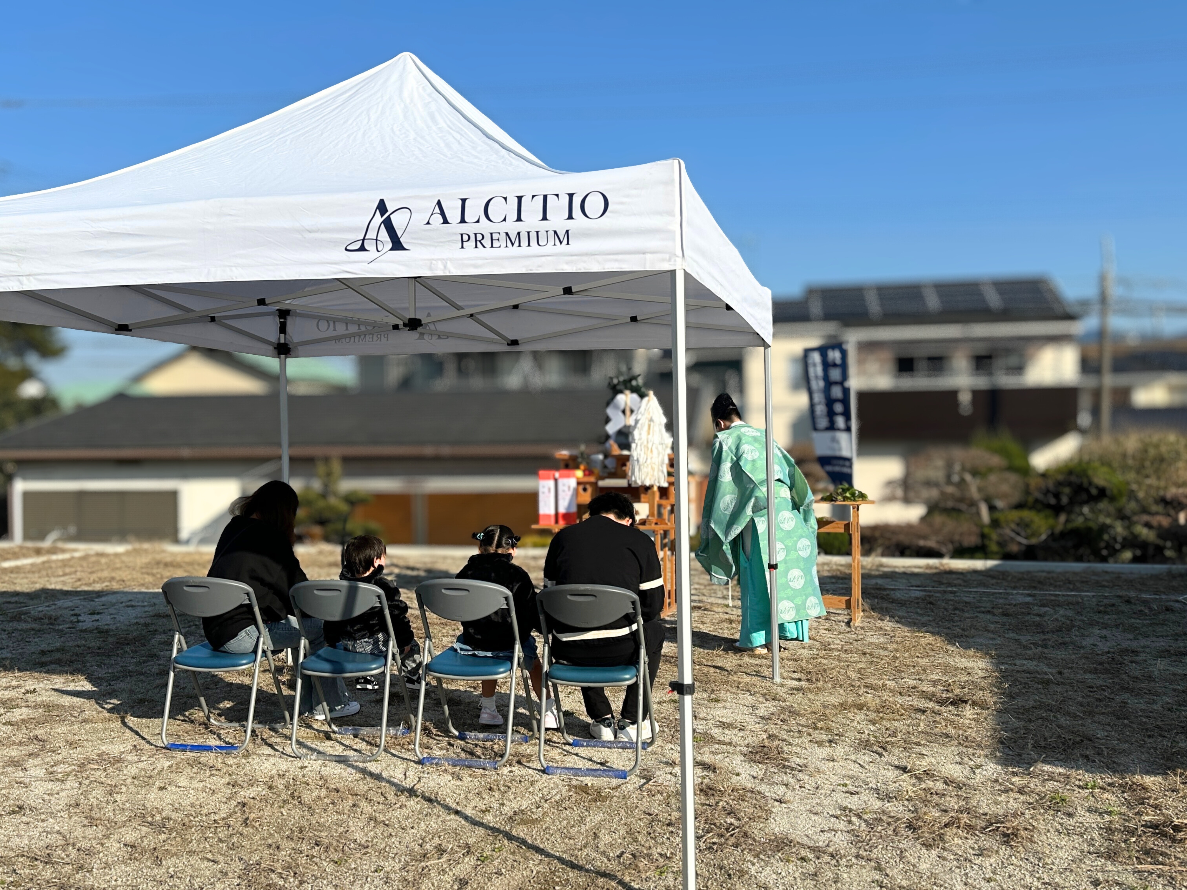白いテントの下、静かに席につくご家族。 神主様の祝詞が響き渡り、敷地全体が凛とした空気に包まれます。晴れ渡る空と、季節外れのやわらかな陽気。 これからこの場所で紡がれていく暮らしのはじまりを、そっと見守るような時間でした。