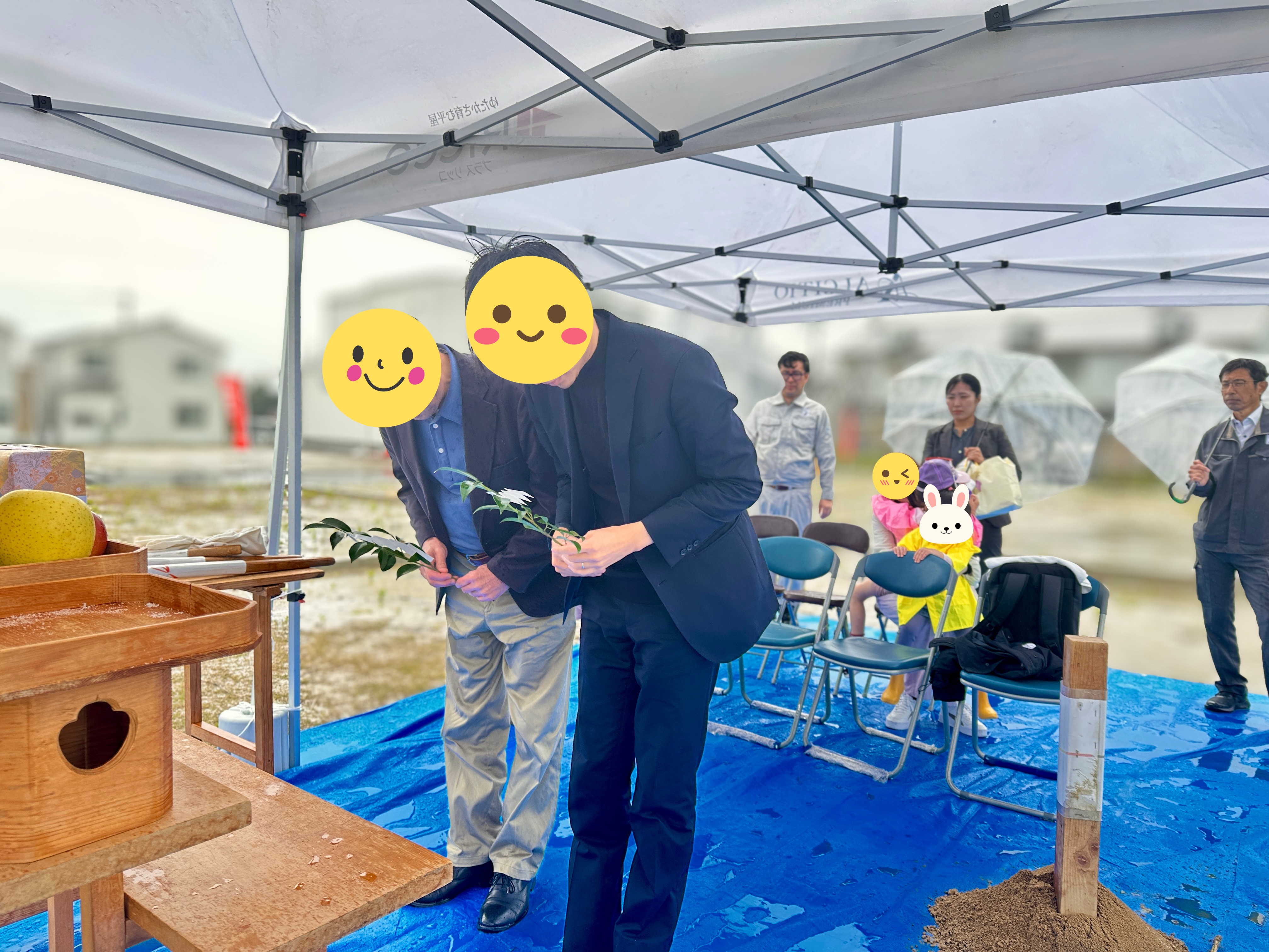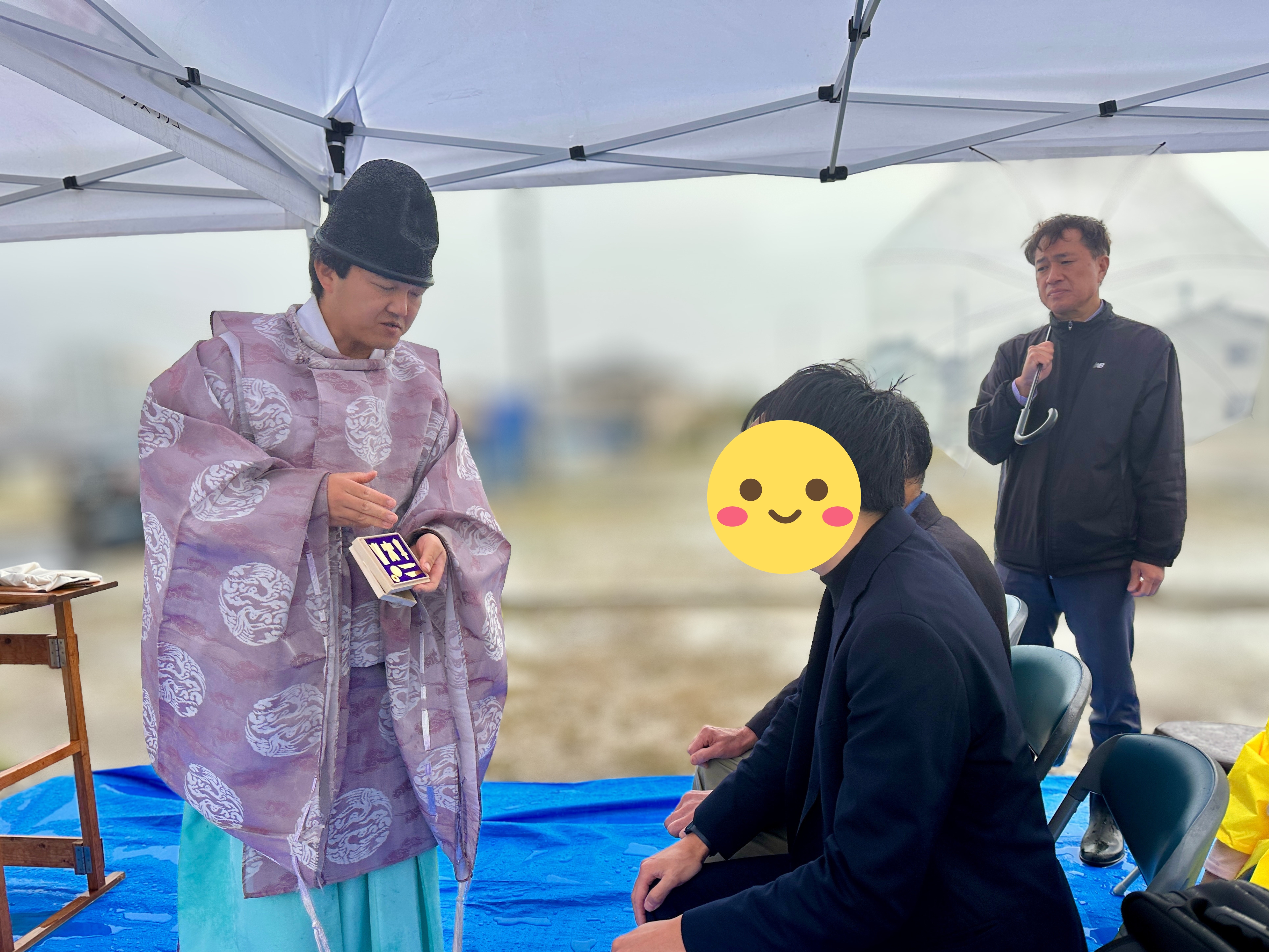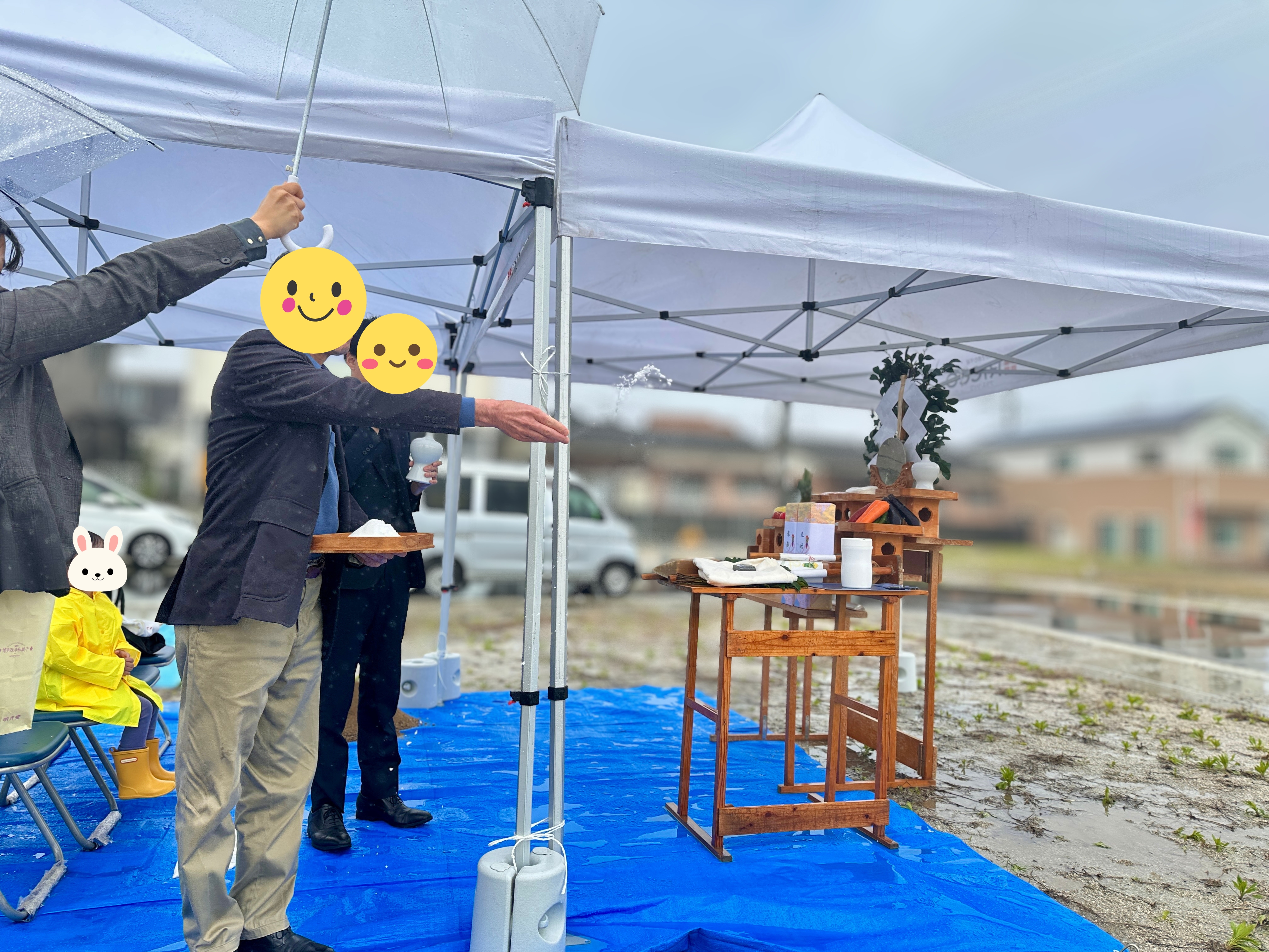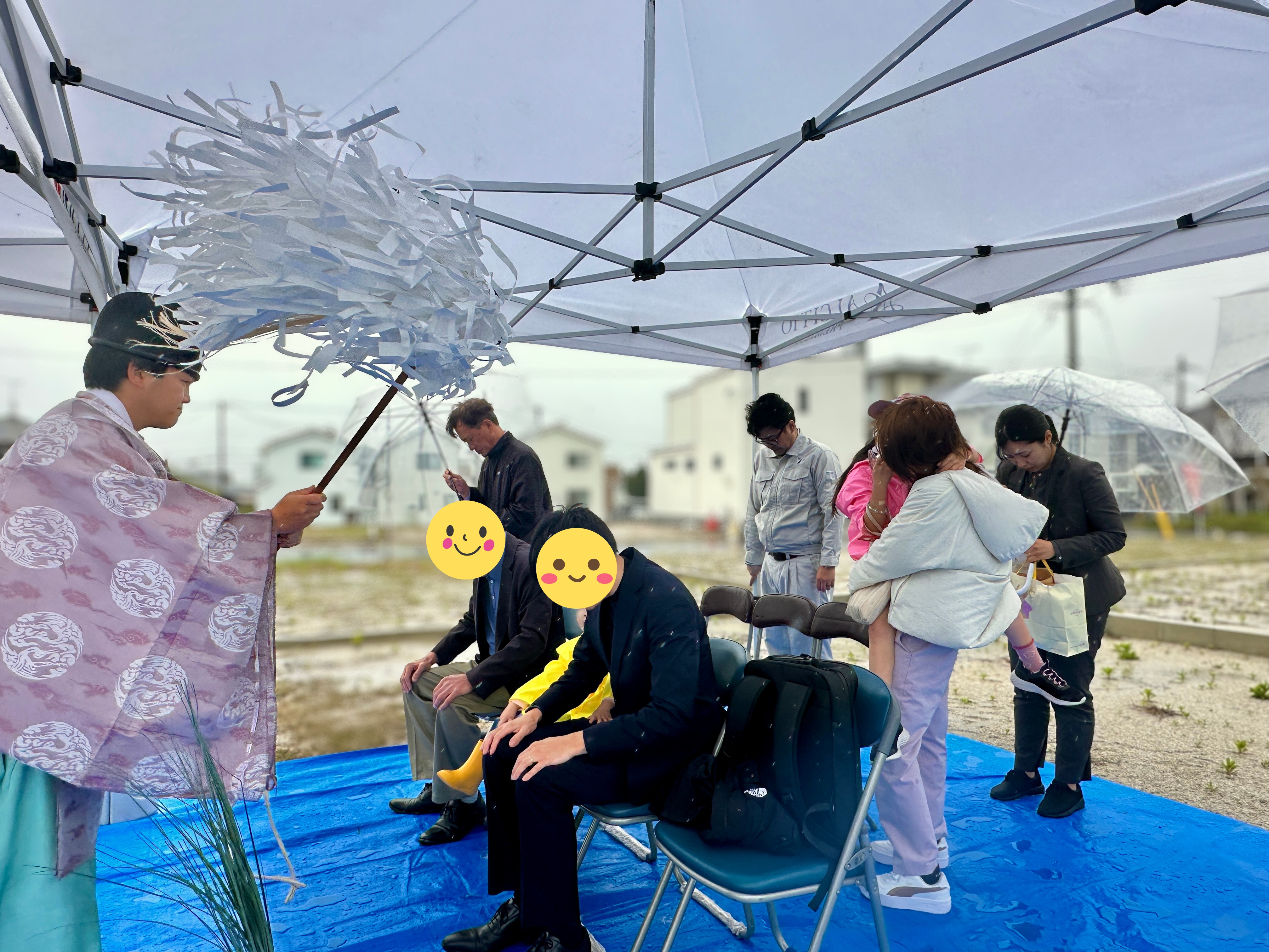 四方祓いが行われ、 敷地の四隅を丁寧にお清めしていきます。 当日は雨のため、テント内での執り行いとなりましたが、雨に包まれた中で丁寧に執り行われました。