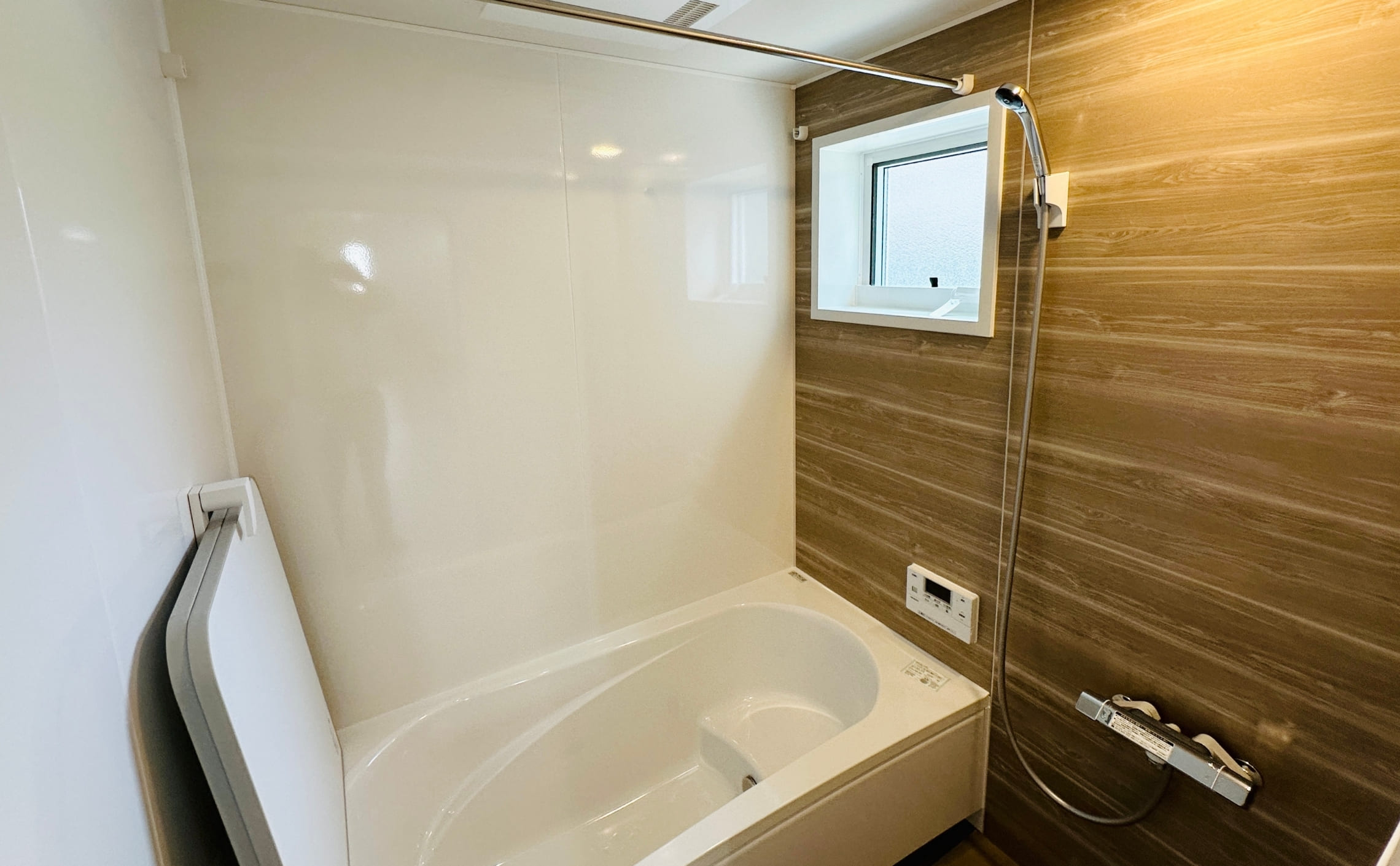 浴室パネルにはグレージュアッシュを選び、ホテルのスパを思わせる上質で洗練された空間に仕上げました。落ち着いた色味と高級感のある質感が、日々のバスタイムを非日常のリラックスタイムへと変えてくれます。