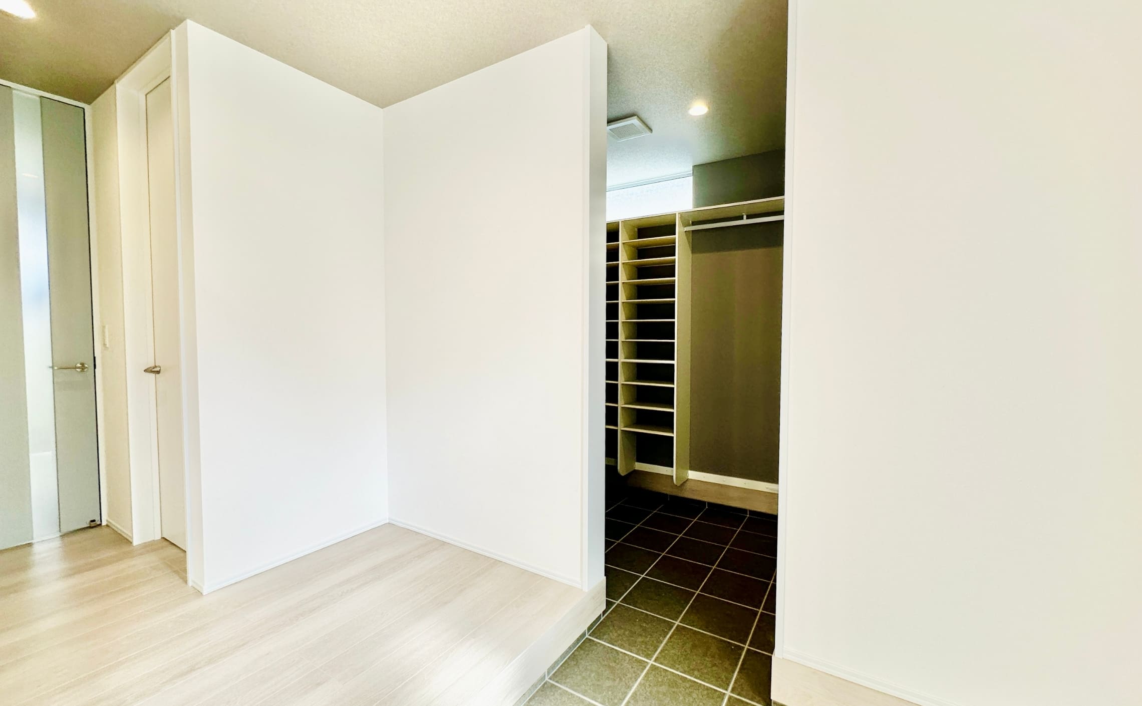 玄関横のシューズクローゼットにはパイプハンガーを備え、靴やブーツに加え、上着やレインコート、傘などもまとめて収納可能。外出・帰宅時の動線もスムーズになります。
