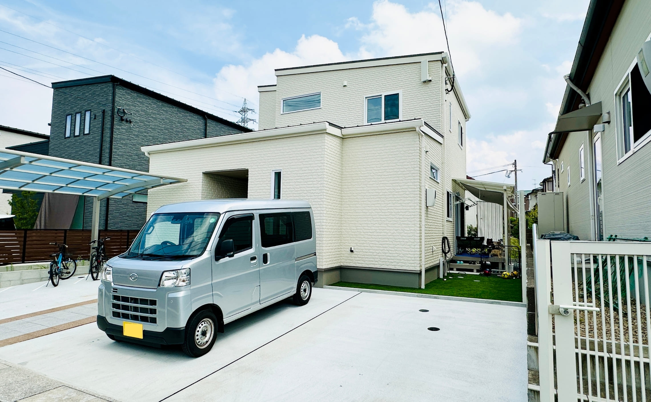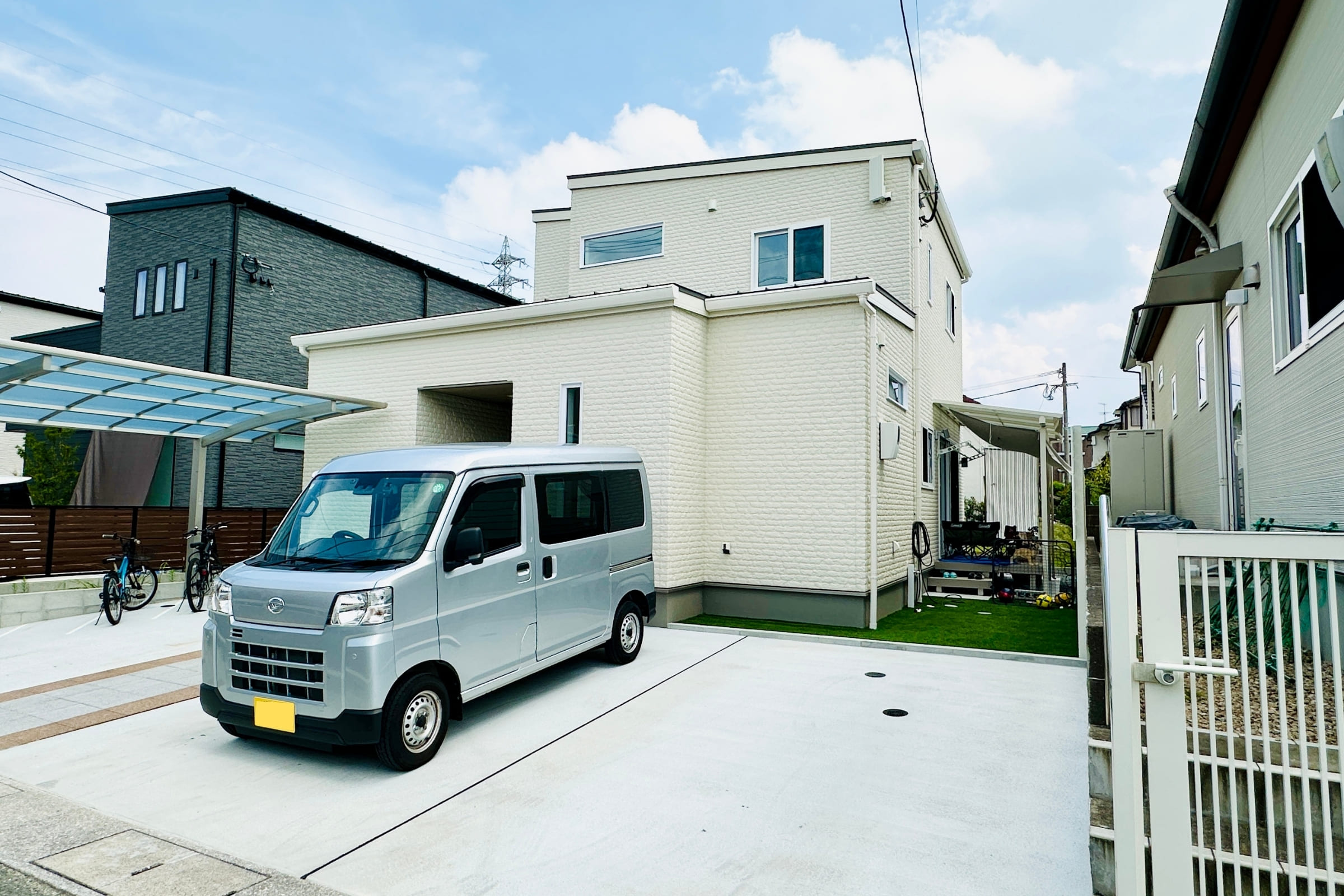 白を基調にしたシンプルでモダンな外観に、凹凸のあるデザインや窓の配置で奥行きを持たせ、洗練された印象に。さらにカーポートを設けることで、自転車や荷物を置けるスペースを確保し、直射日光や雨から守ることができます。