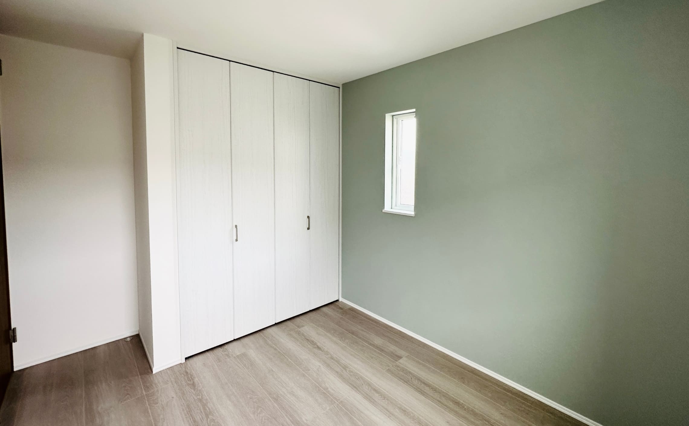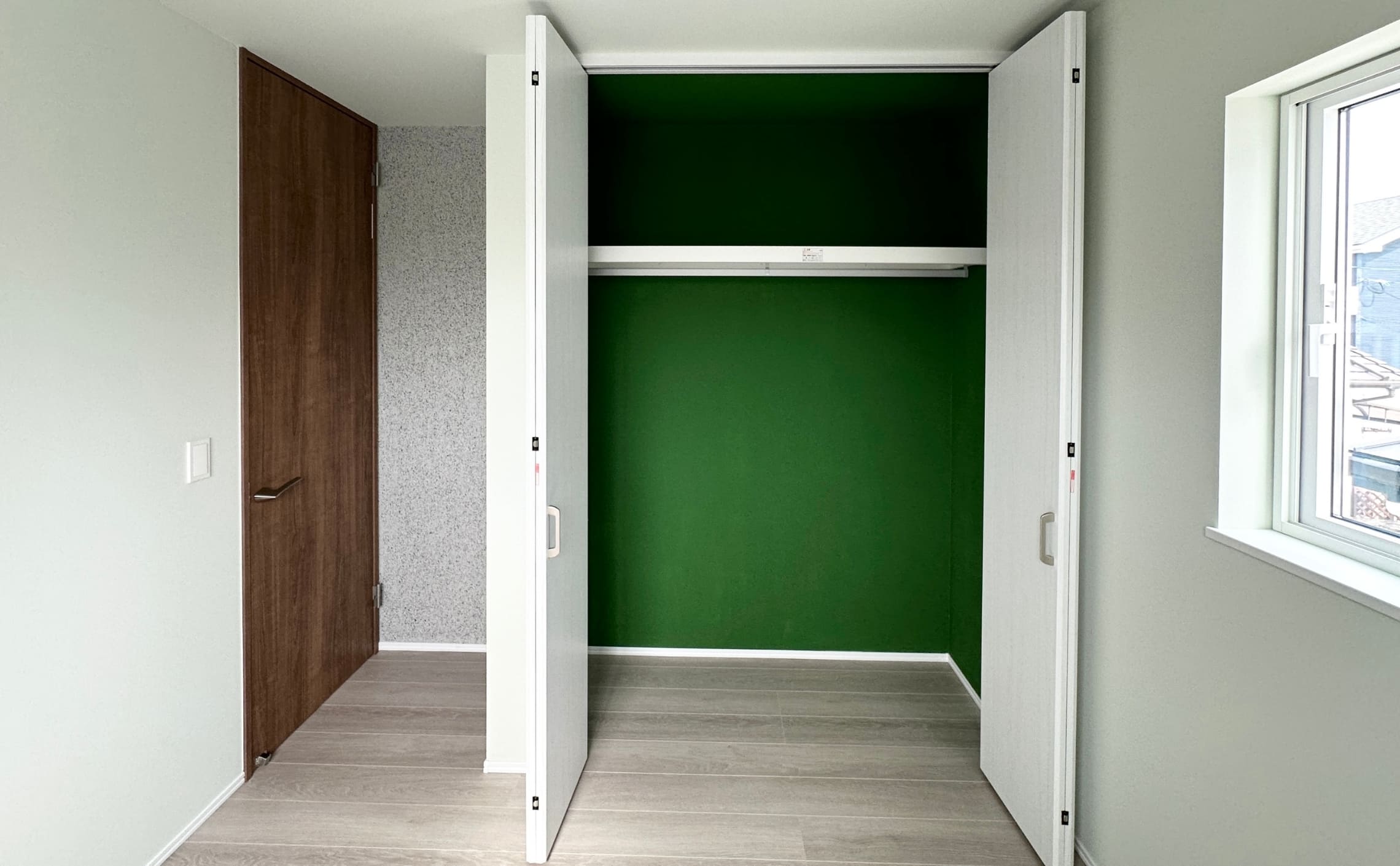 扉を開けた瞬間に目を引く、深みのあるグリーンで仕上げたクローゼット。塗装仕上げならではの上質感が、収納スペースにも個性を与えます。お施主様のお子様が塗装されました。