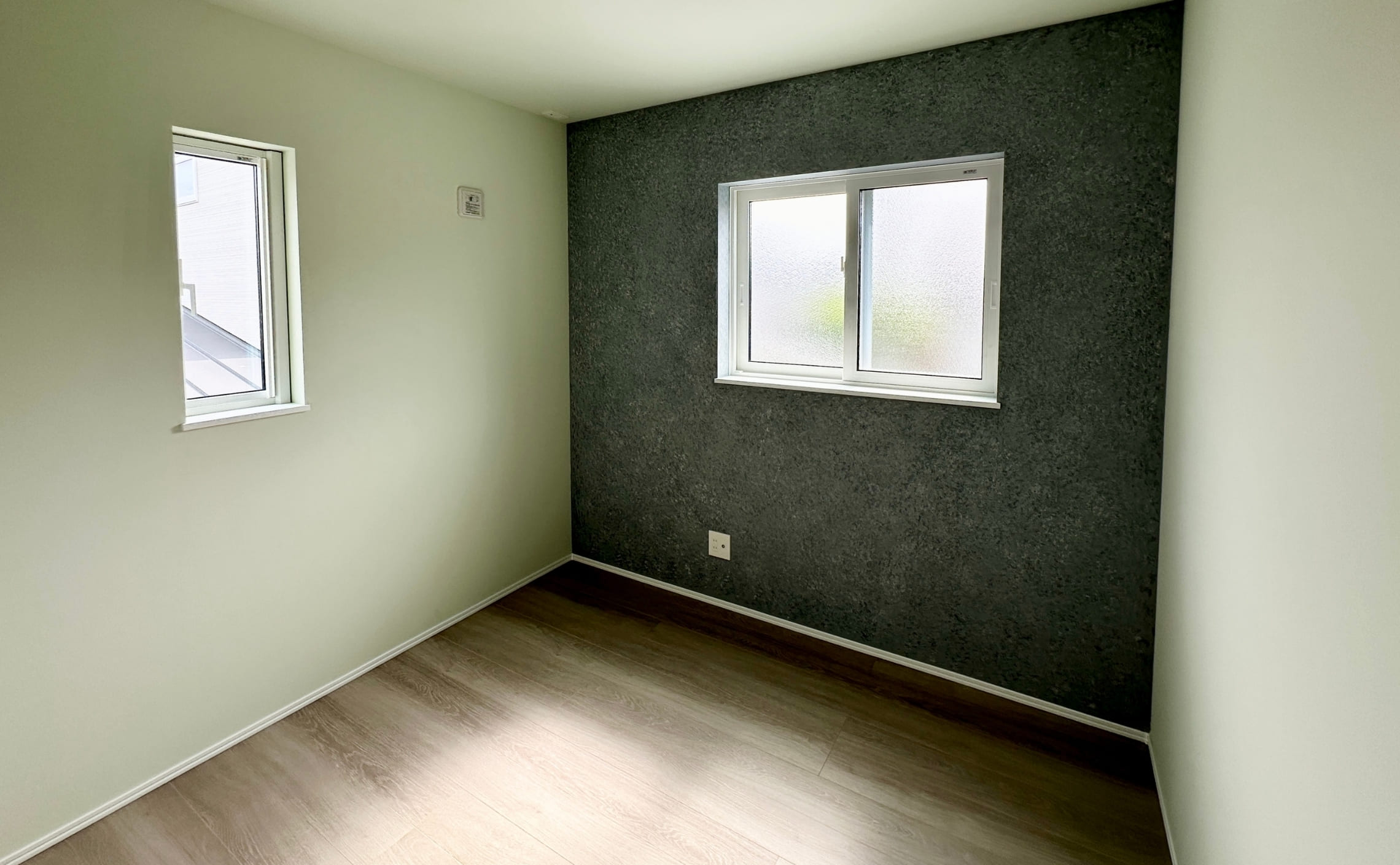 落ち着きと個性を兼ね備えたブルーグリーンのアクセントクロスを配置。空間全体をぐっとおしゃれに見せ、心地よい空間になっています。