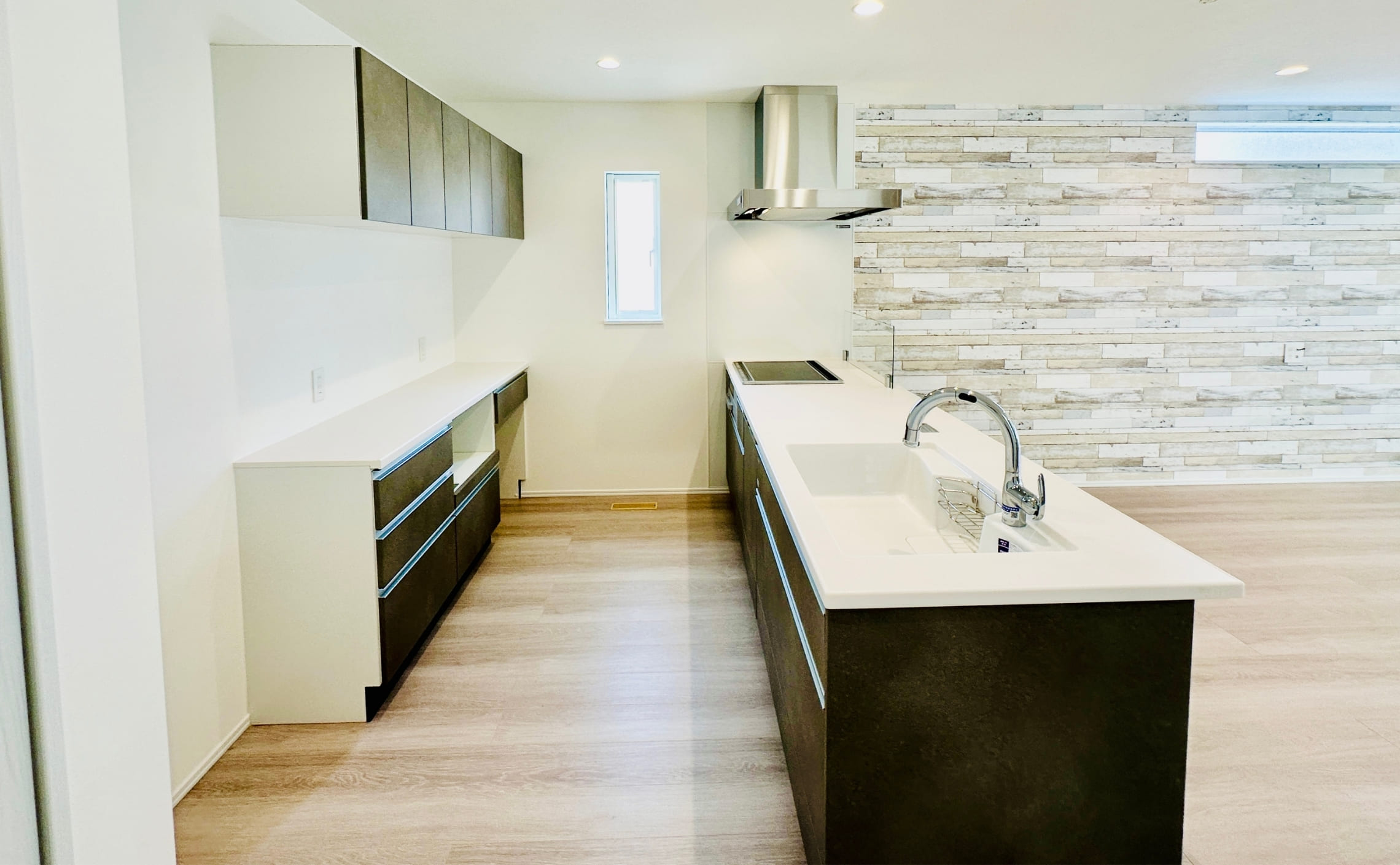 落ち着きのあるグレーのキッチンは、シンプルながら上質感のあるデザイン。窓を設け明るい空間になっています。