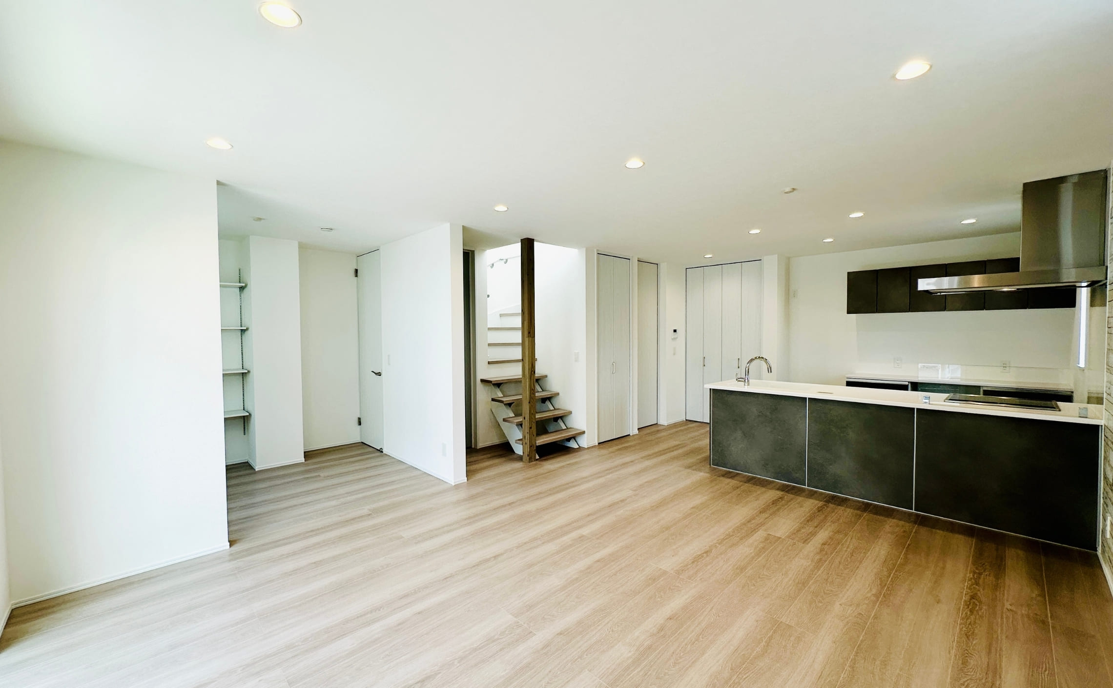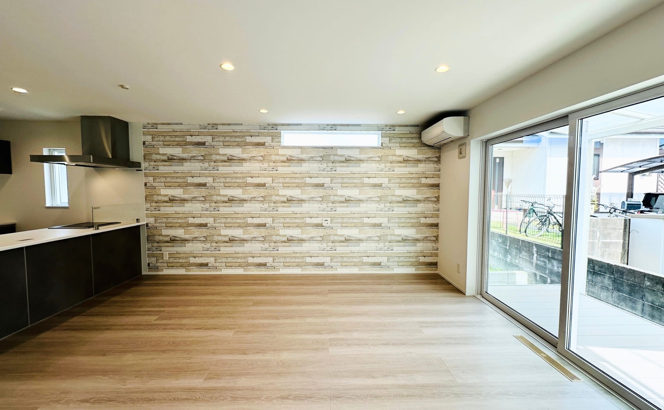 ヴィンテージ感漂うホワイトウッド調のアクセントクロスを壁面に採用し、空間に温もりと個性をプラスしました。さらに壁掛けテレビを設置予定で、リビングをよりすっきりスタイリッシュに演出します。