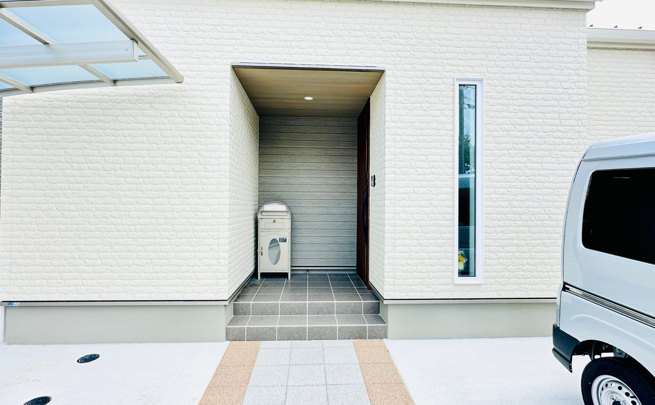 グレーのタイルが落ち着いた雰囲気を演出する玄関まわり。軒天を設けることで、郵便物が雨に濡れにくく、毎日の出入りも快適です。シンプルながら機能性にも配慮したデザインが魅力です。