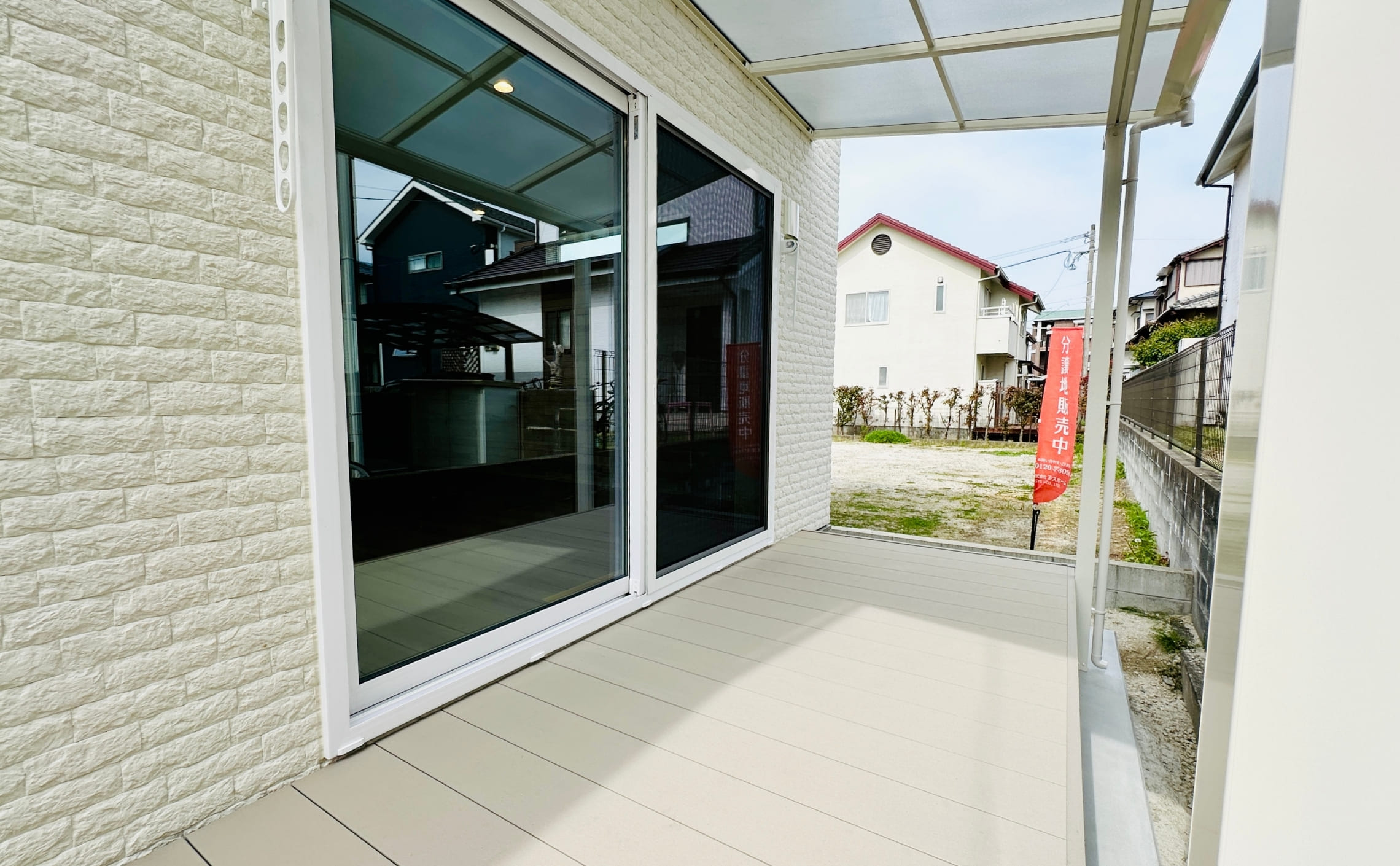 リビングとフラットにひと続きになったウッドデッキは、家の中と外をやさしくつなぐ特別な空間です。洗濯物を干す実用的な使い方はもちろん、休日には家族でゆったりくつろぐ場所としても活躍します。