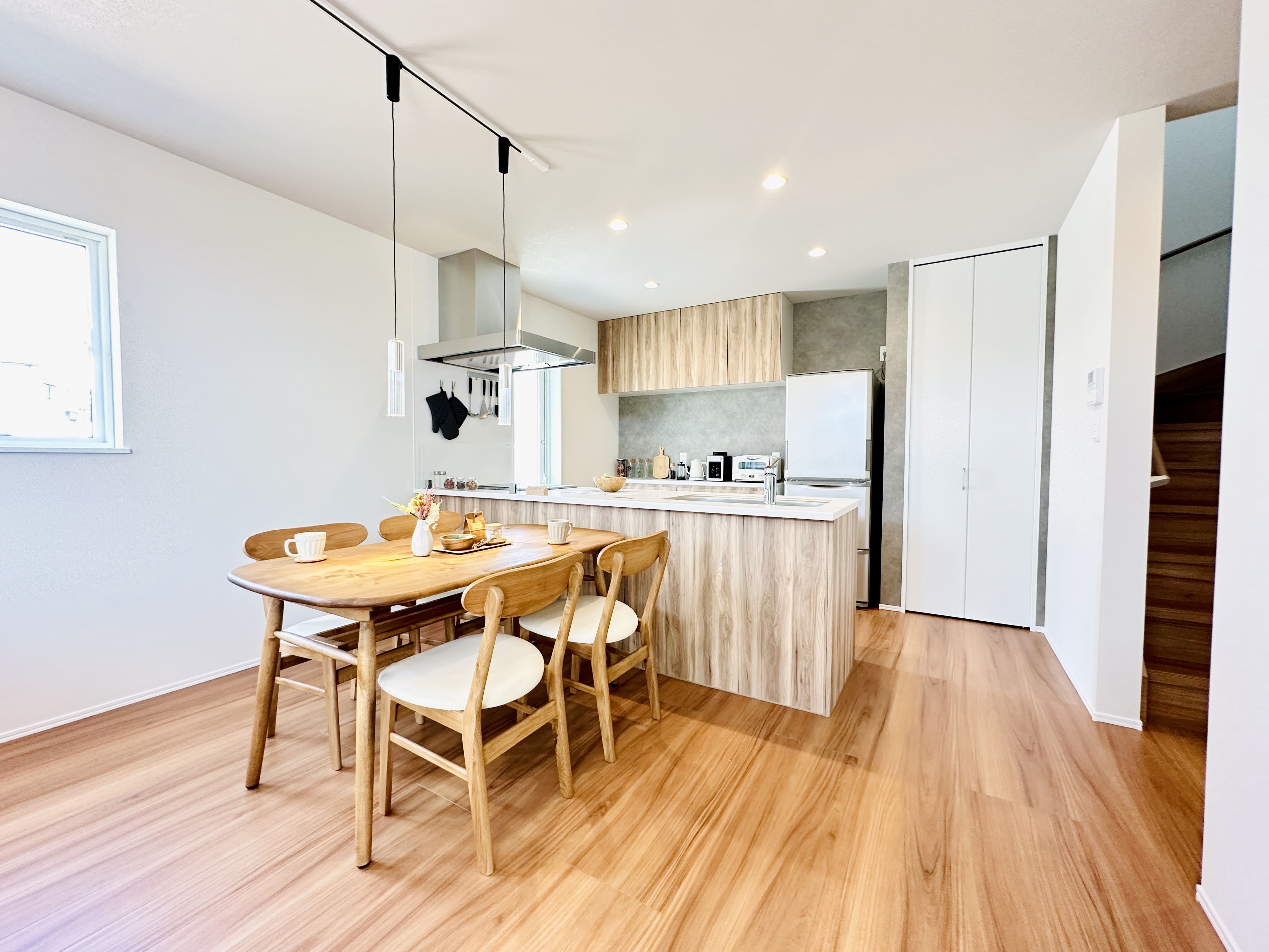 淡い木目で統一したキッチンとダイニングが、空間全体にやさしい温もりをもたらします。 近くに設けたパントリーが収納力を高め、日常使いのしやすさにも配慮しました。