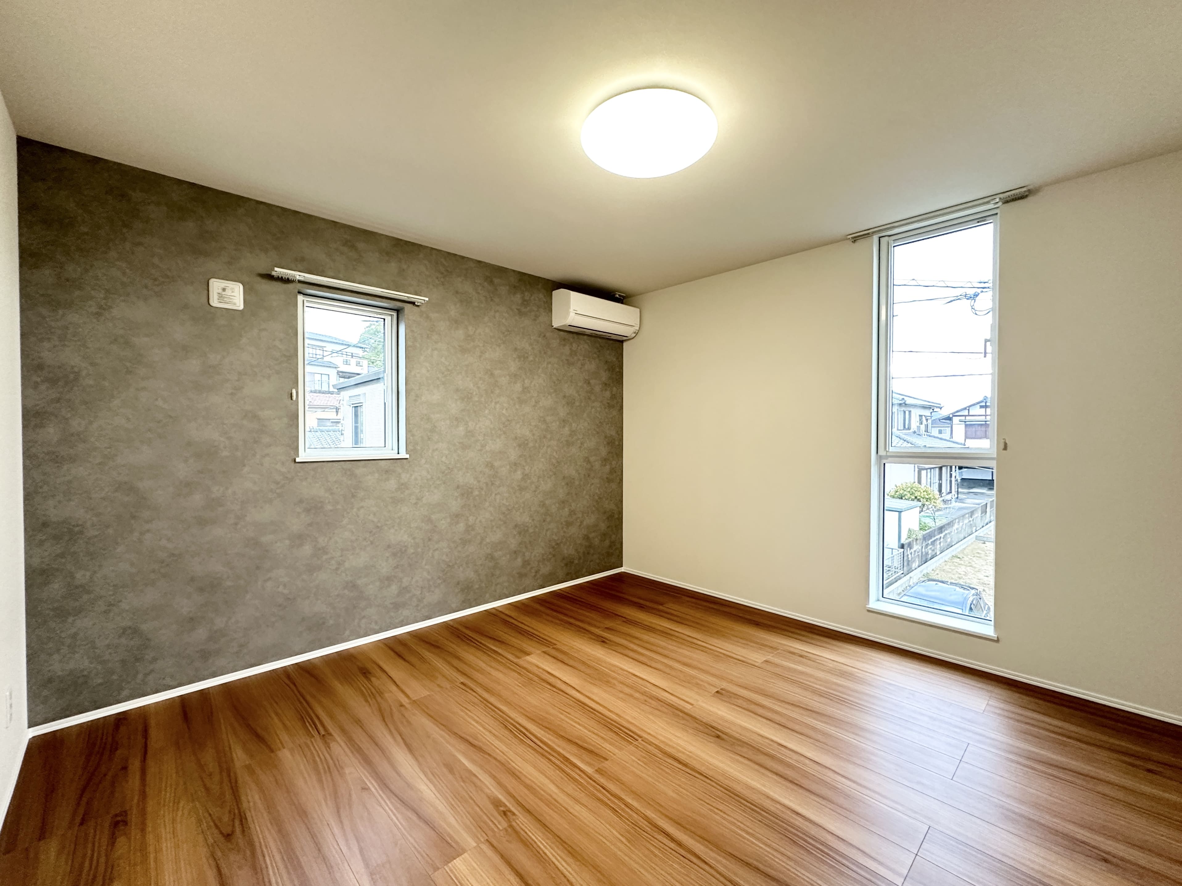 グレーのアクセントクロスが映える、8帖の洋室。 二面の窓からやわらかな自然光が差し込み、落ち着きと明るさを両立した空間に仕上げました。