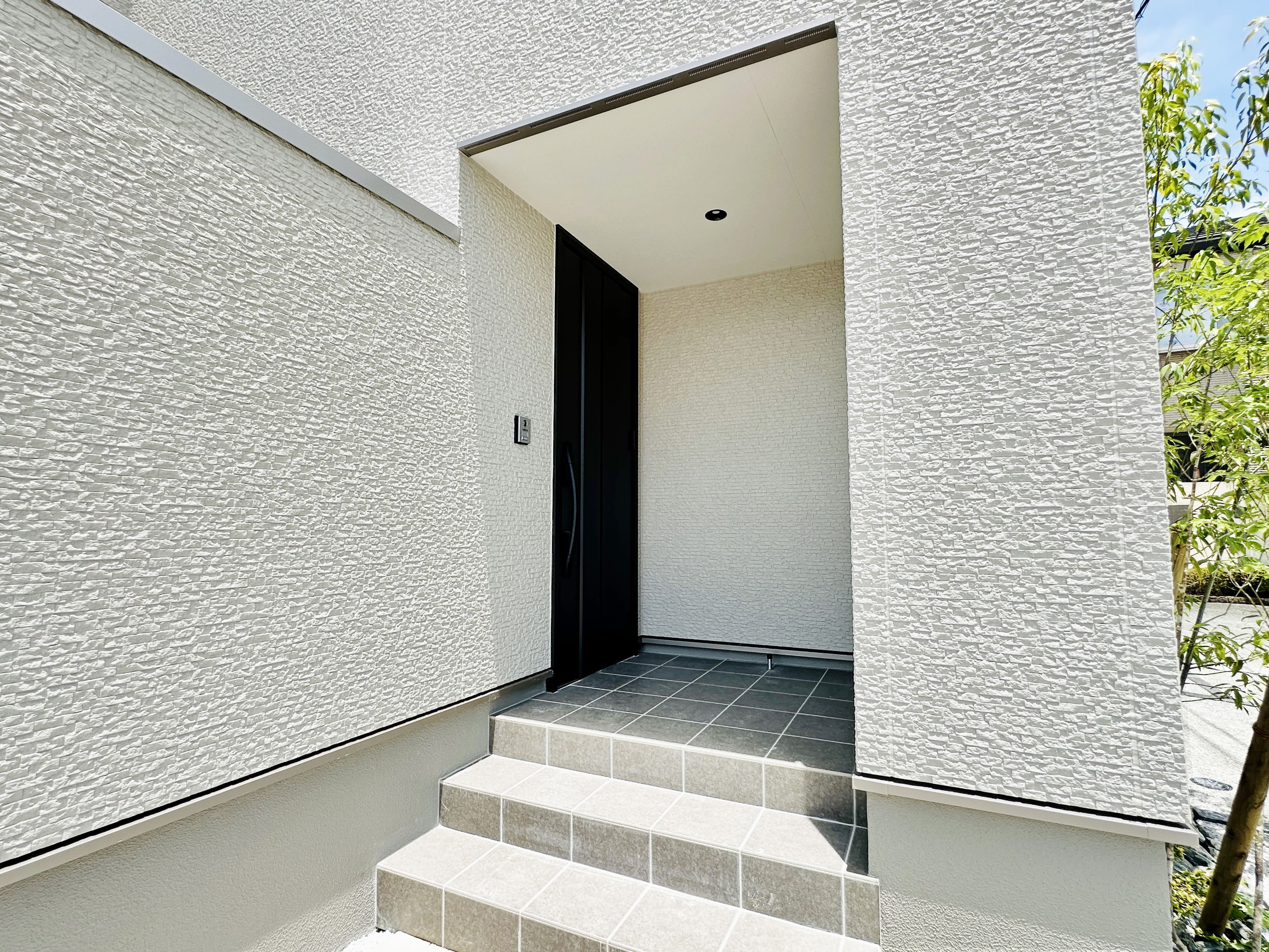 雨風を避けるだけでなく、出入りする様子が見えないように壁で囲み、セキュリティにも配慮した玄関ポーチ