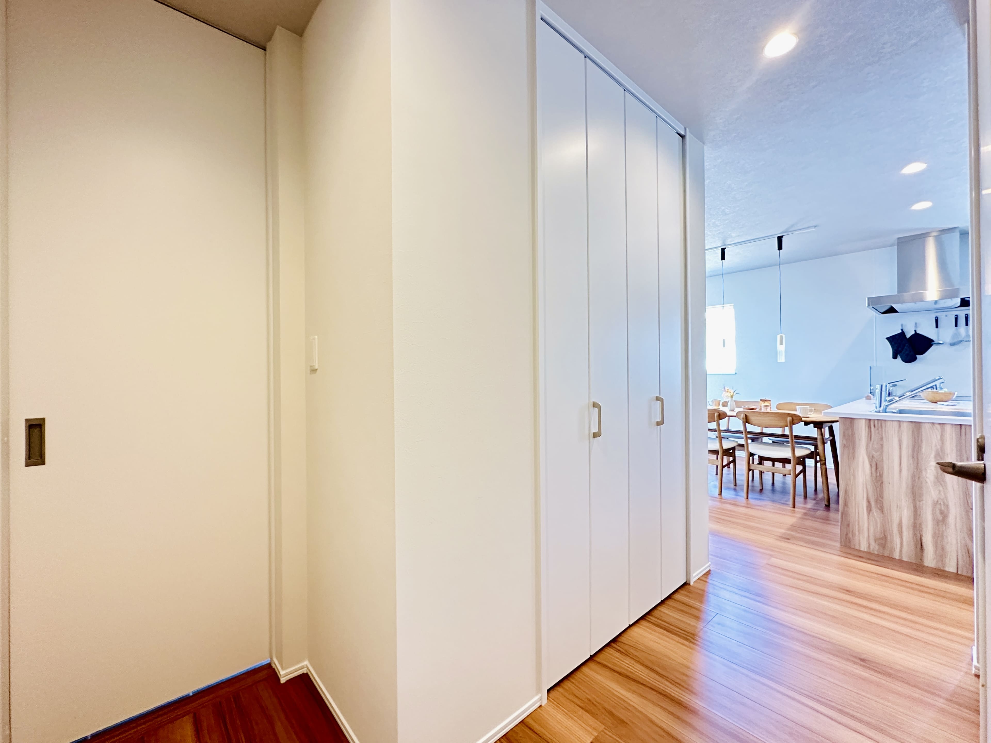 一階に2帖のファミリークローゼットを備え、外出準備や帰宅後の片付けもスムーズ。 暮らしの流れに寄り添った、使い勝手の良い