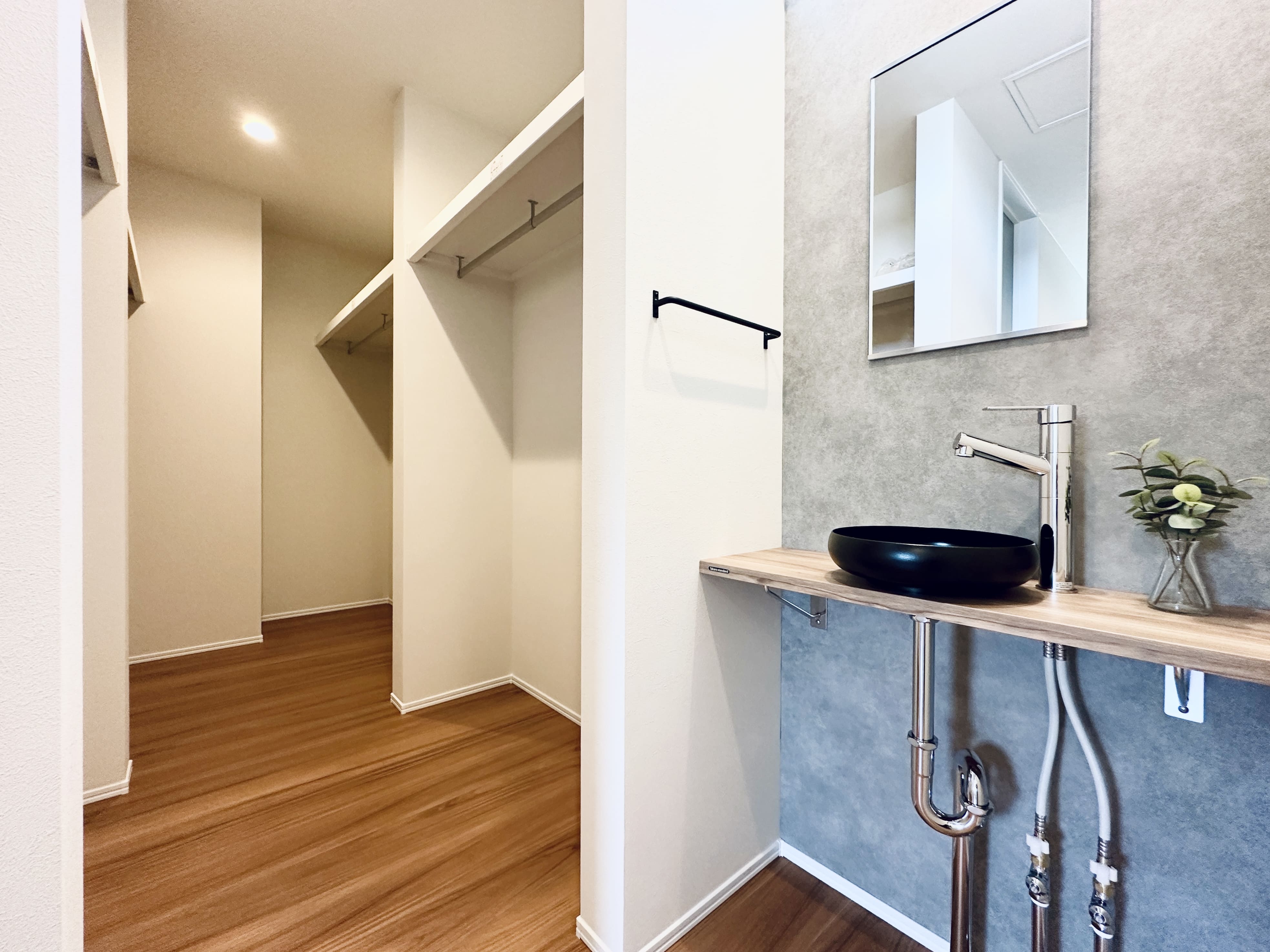 2階にはファミリークローゼットの近くに造作洗面台を設け、身支度や手洗いがスムーズに行えるよう配慮しました。