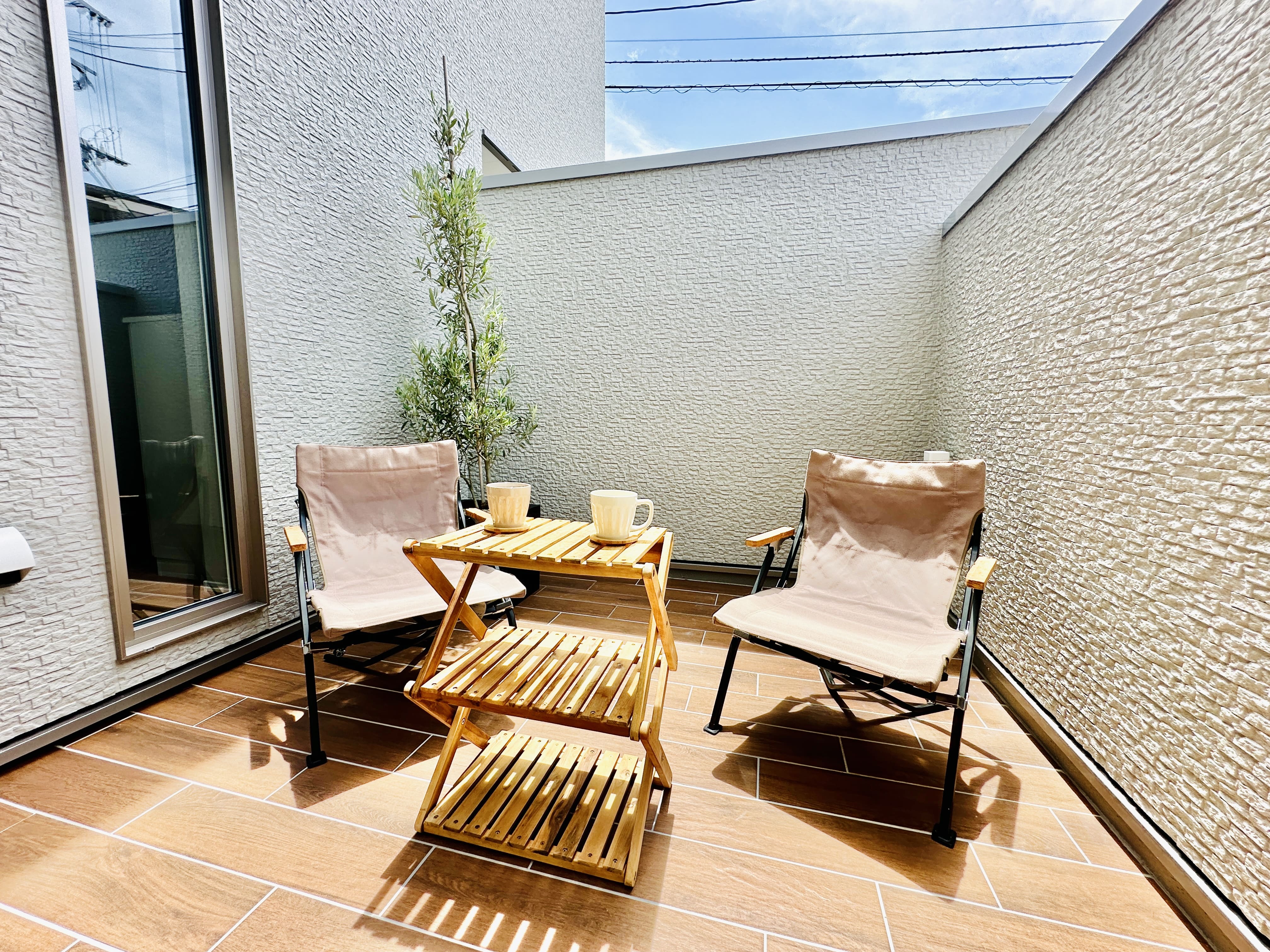 リビングからそのまま出られるウッド調タイルの4.2帖の中庭。開放的な空間が日常に光と風を取り込みます。