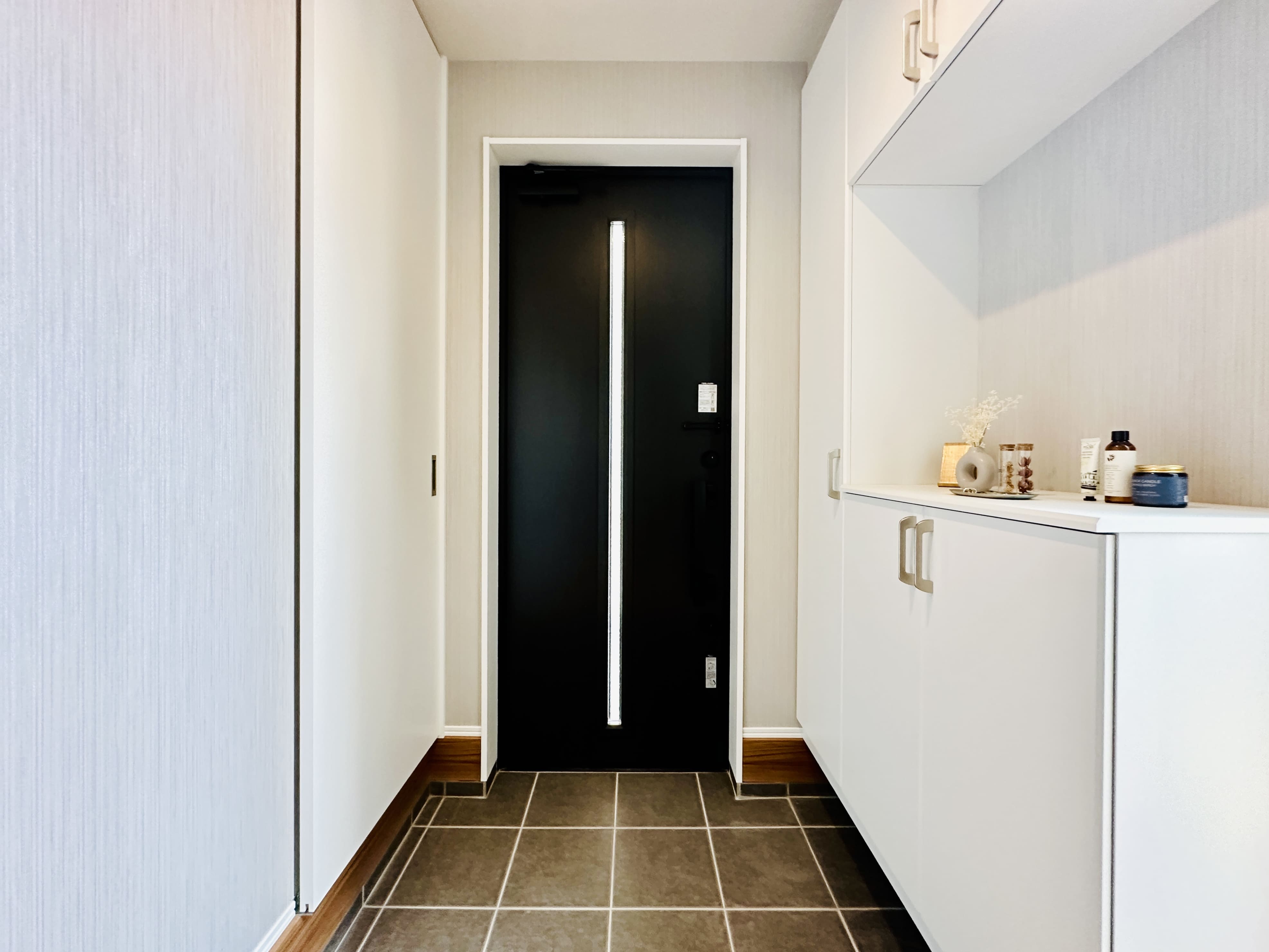 マットブラックの玄関ドアが空間を引き締める玄関。 左手のドアを進めばリビングや洗面室へとつながる、便利な2Way動線です。