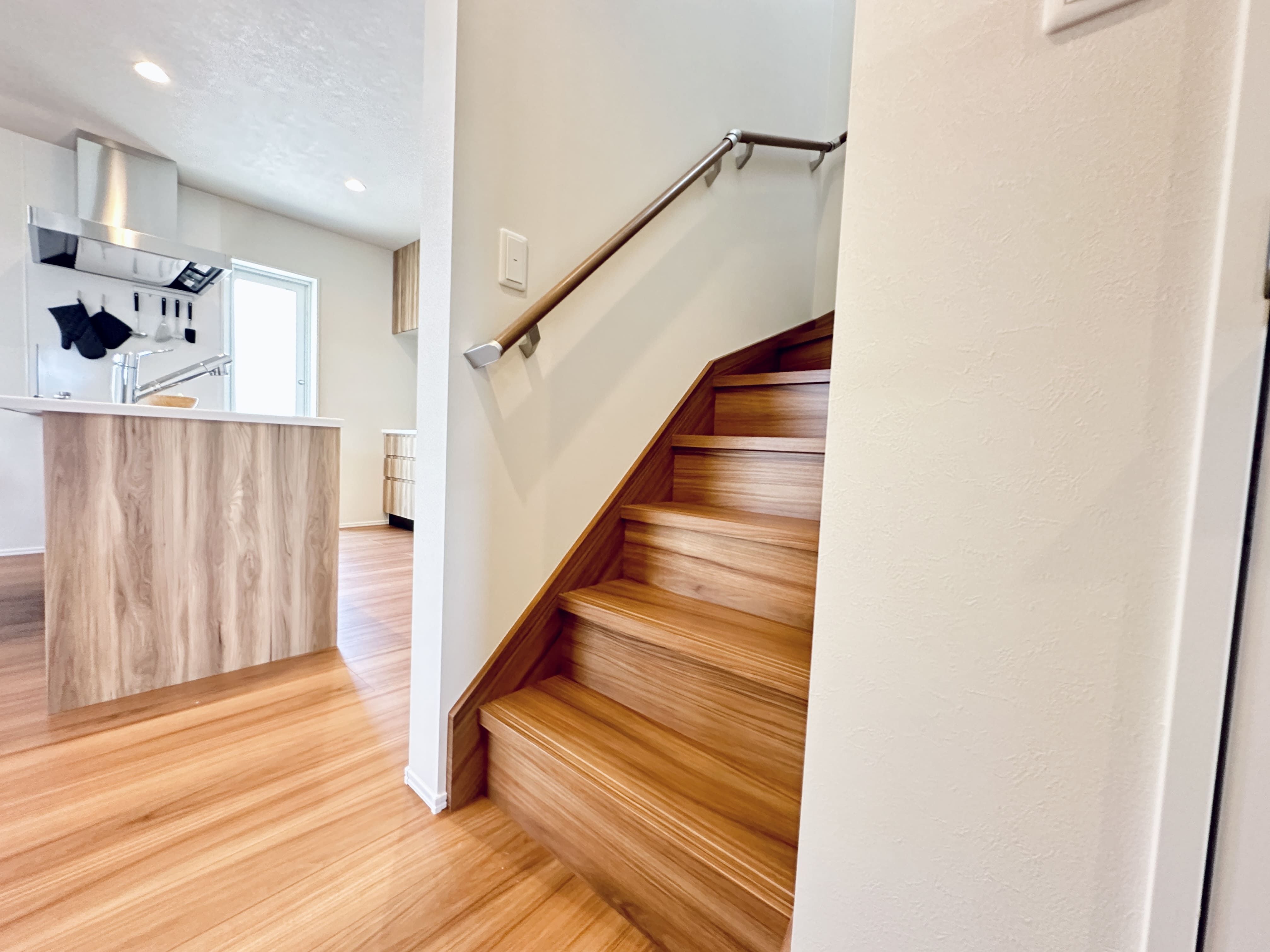 リビング横に設けた階段が、空間と家族をやさしくつなぐ設計。 行き交うたびに声を掛け合える、あたたかな住まいです。
